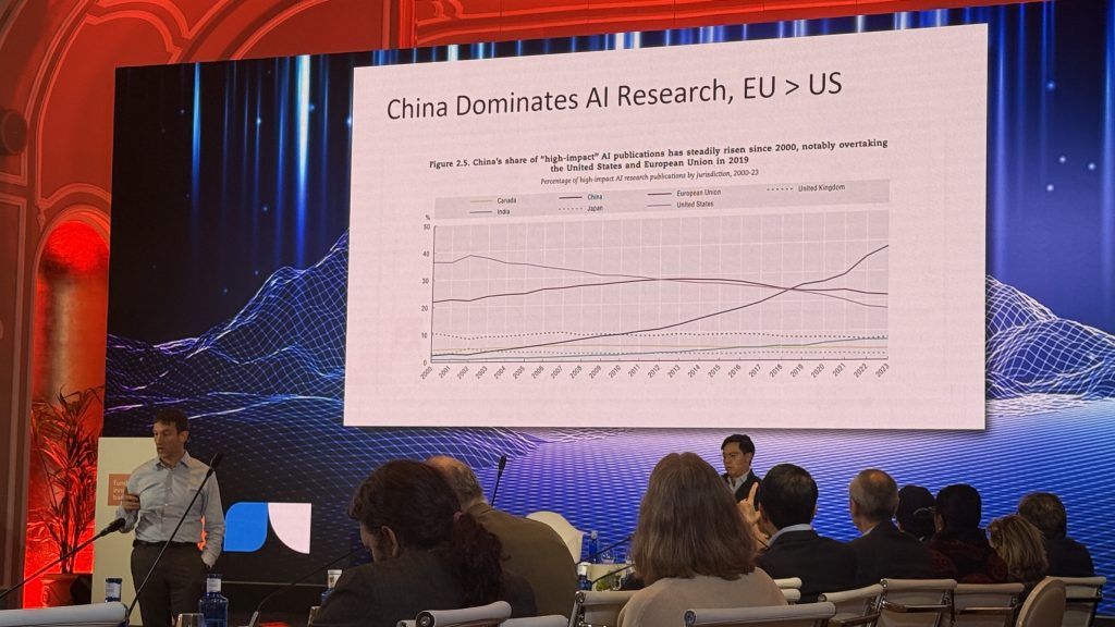 Shochat began by illustrating China’s rapid ascent in AI research output. The data revealed that China’s share of “high-impact” AI publications has significantly outpaced both the United States and the European Union since 2019. This trend is a stark reminder of how geopolitical priorities shape innovation, raising important questions about how nations prioritize their investments in technology and education.